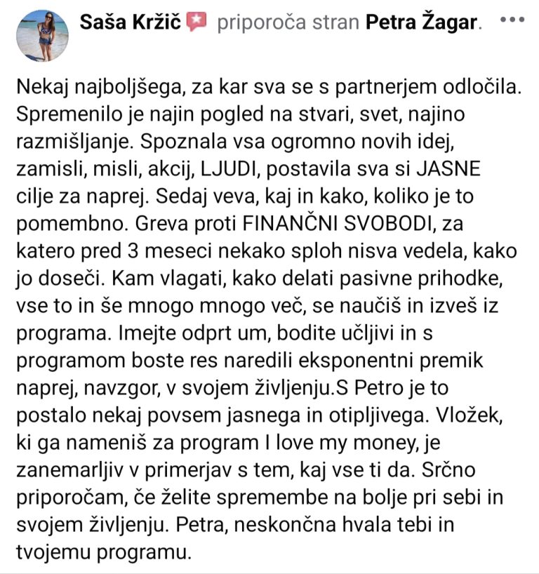 Za program I LOVE MY MONEY sem se odločila “čisto po naključju”. Skočila v vodo, brez razmišljanja ali znam plavat ali ne, in ni mi žal. Petra, bila si čudovita, “s tabo” sem preživela temo zime in se pognala novim zmagam naproti. Ta program zame sploh ni bil samo razmišljanje o denarju, ampak rast na vseh področjih mojega življenja. Poleg tega, da sem ukinila limit na banki, vrnila kreditno kartico, redno plačala vse obroke programa in uredila vsa zavarovanja, sem nekaj prihrankov tudi že vložila. Predvsem pa sem doživela veliko lepih presenečenj, ki si jih niti v najlepših sanjah ne bi mogla zamislit. Pregnala sem strah, negotovost, delam na samozavesti in še bi lahko naštevala. Program I LOVE MY MONEY priporočam vsakomur, ki si želi urediti finance, delati na sebi in spoznati občutek, da zmore vse. Toliko lahko iskreno povem – poleg tistega, kar sem že v začetku januarja napisala, kako sem si povrnila stroške prvega obroka plačila. Lep pozdrav in veliko uspeha ti želim, verjamem, da se še kdaj srečamo.